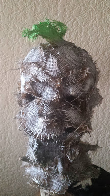 Simple components: Stryofoam head, straight pins, burlap (a yard will do), Elmer's glue, paint brush, paints (black, rust, straw color).